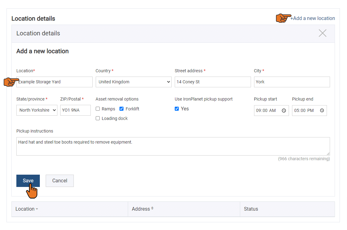 The Ritchie Bros. Asset Solutions Inventory Management System allows each user to manage their own locations. This feature allows a user to enter all the information about a storage location once and then re-use that same location information every time they add an asset by selecting the location from a dropdown.