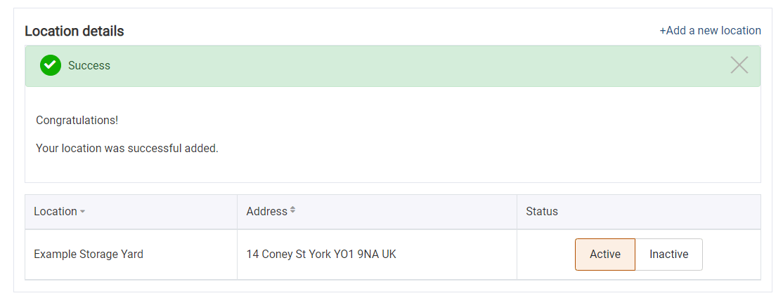 - After you have saved you will see a confirmation message and then the page will refresh and show you the location you just added.