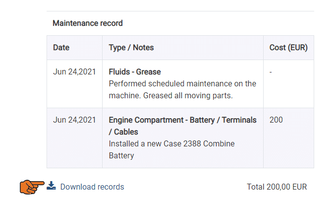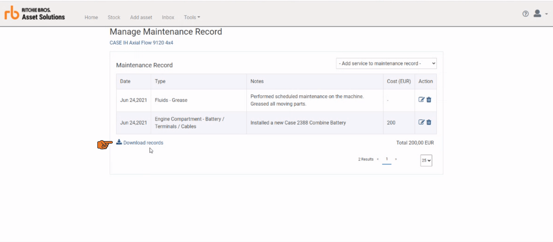 If you wish to export your maintenance record for an asset you can do so by clicking the download reports link at the bottom of the table.