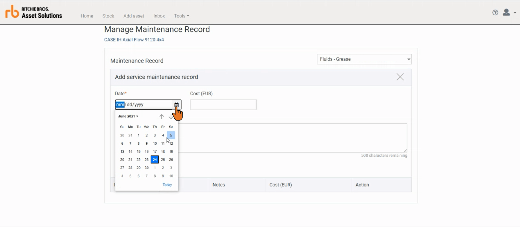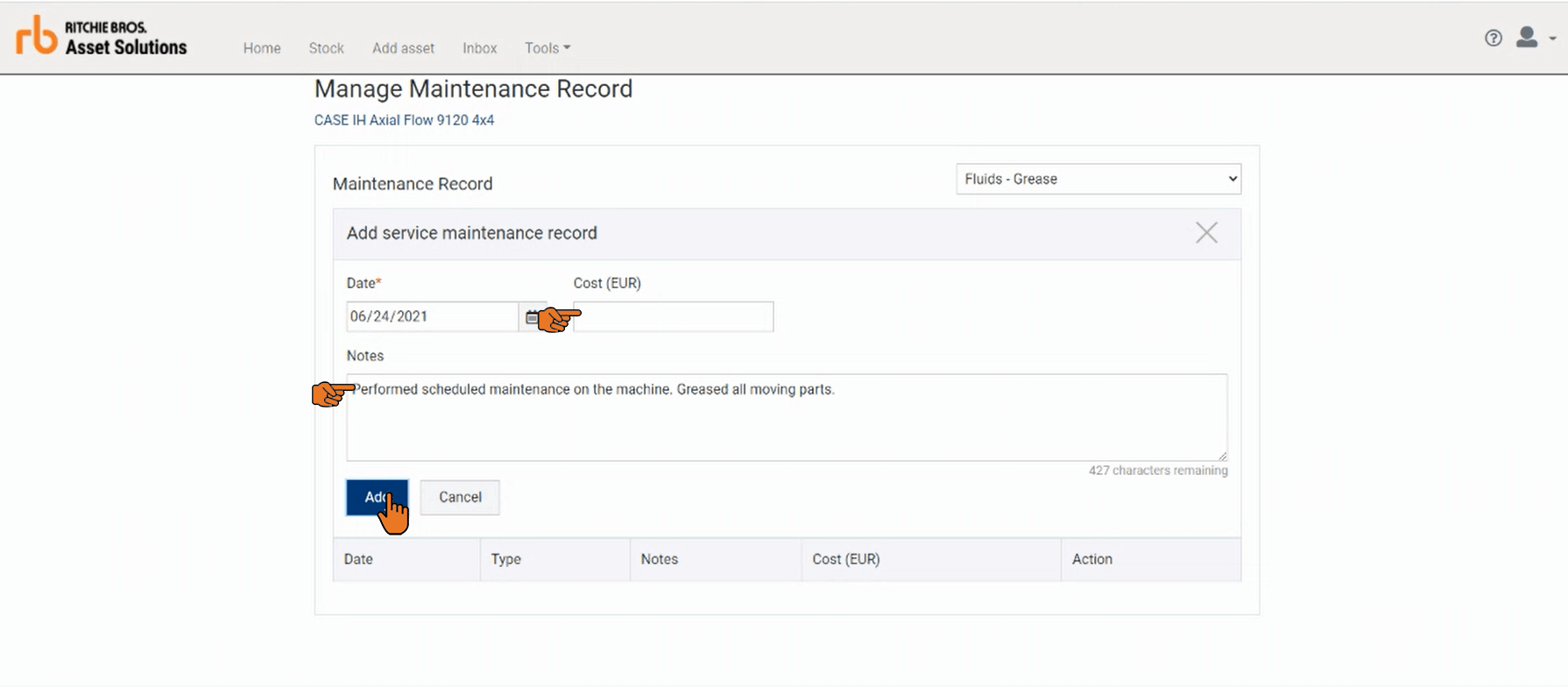As an additional option, you can choose to capture the cost of the maintenance or enter a note of up-to 500 characters about the maintenance that was performed. To save your entry to the record click the Add button.