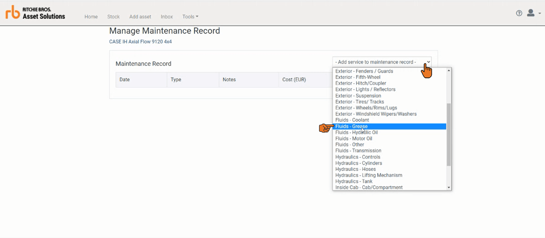 In the top right-hand corner of the maintenance record screen click add service to maintenance record. Then select the type of service record you wish to add. The menu is ordered by the area of the equipment in which the maintenance may be performed (e.g. Attachments, Engine Compartment, Exterior, Fluids, Hydraulics, Inside Cab and Safety Equipment)