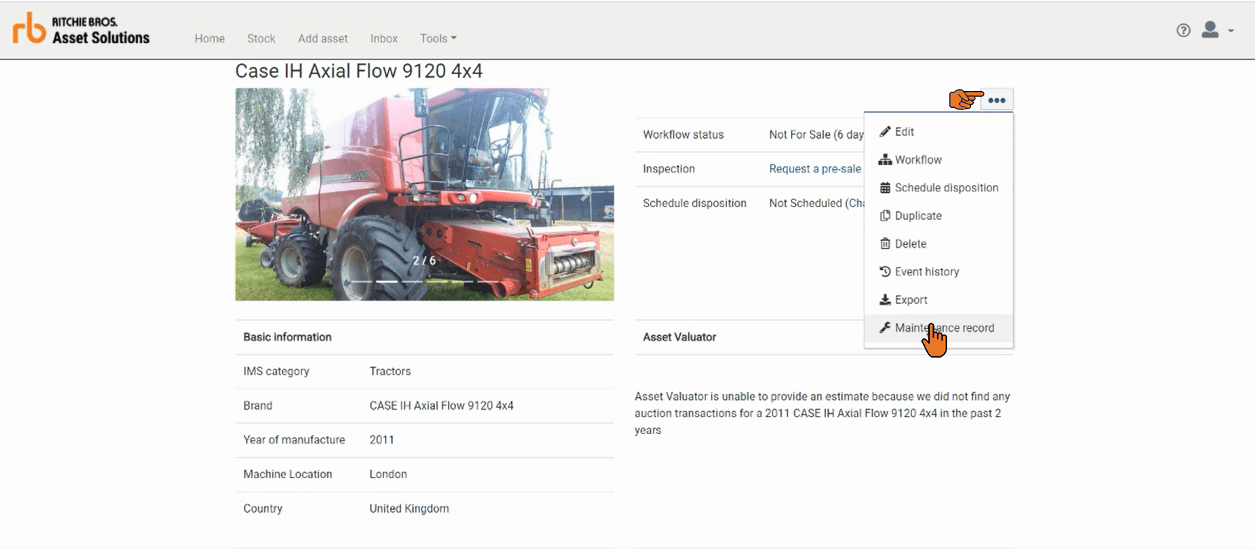 Find the asset you which to add a record, then, in the right hand corner of a search result or an asset detail page click the ellipsis (...) button and select the Maintenance record option.